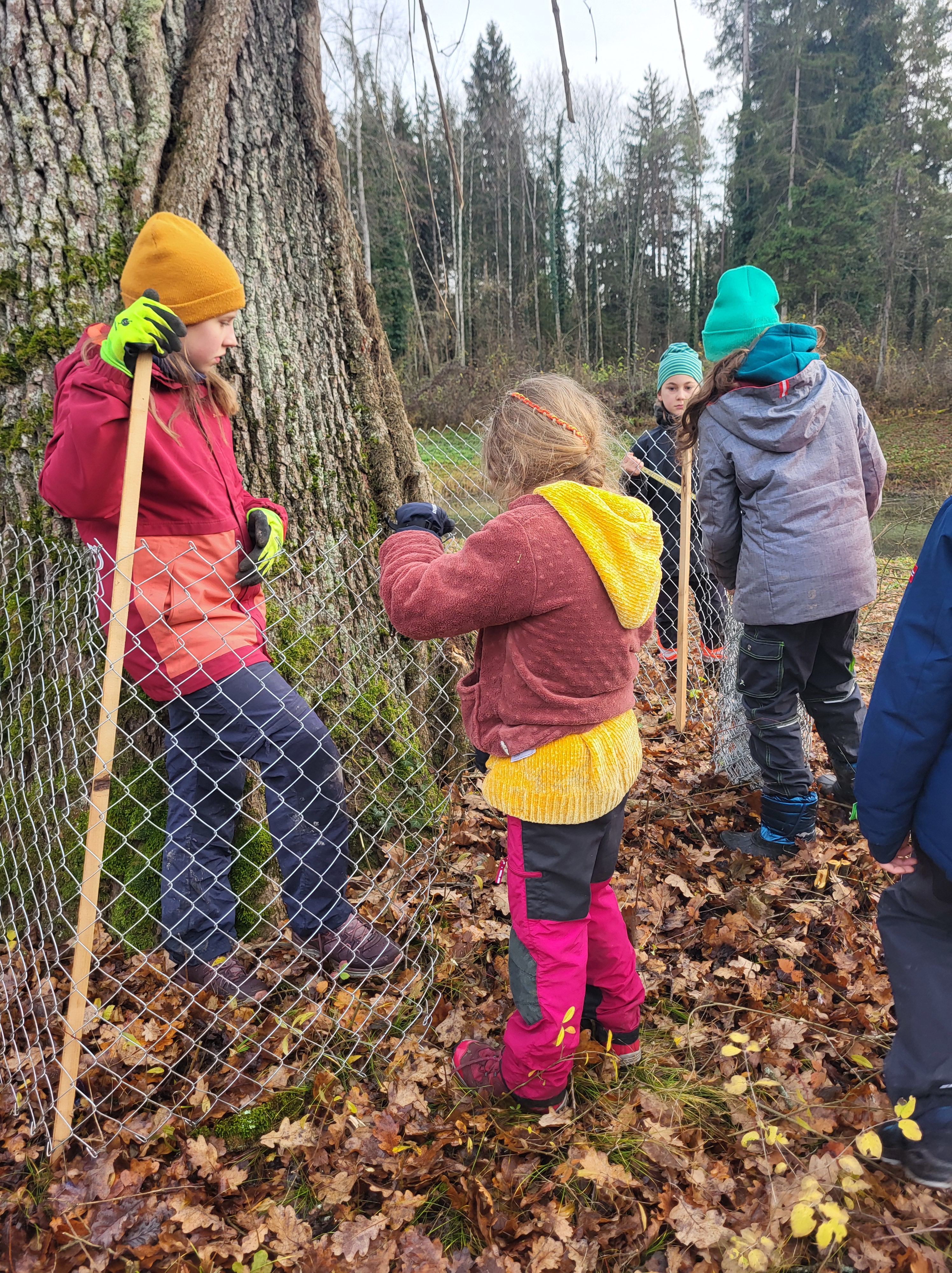 Der wichtigste Teil des Nachmittags war dann der praktische Einsatz für den Naturschutz. Unsere Försterin erklärte uns die Bedeutung alter, grosser Eichen, die als sogenannte Samenträger dienen. Diese Bäume sind essenziell für die natürliche Verjüngung des Waldes, da sie die Samen für künftige Baumgenerationen liefern. Da der Biber in diesem Bereich sehr aktiv ist und bereits viele dieser wichtigen Bäume angefressen hat, mussten wir handeln.