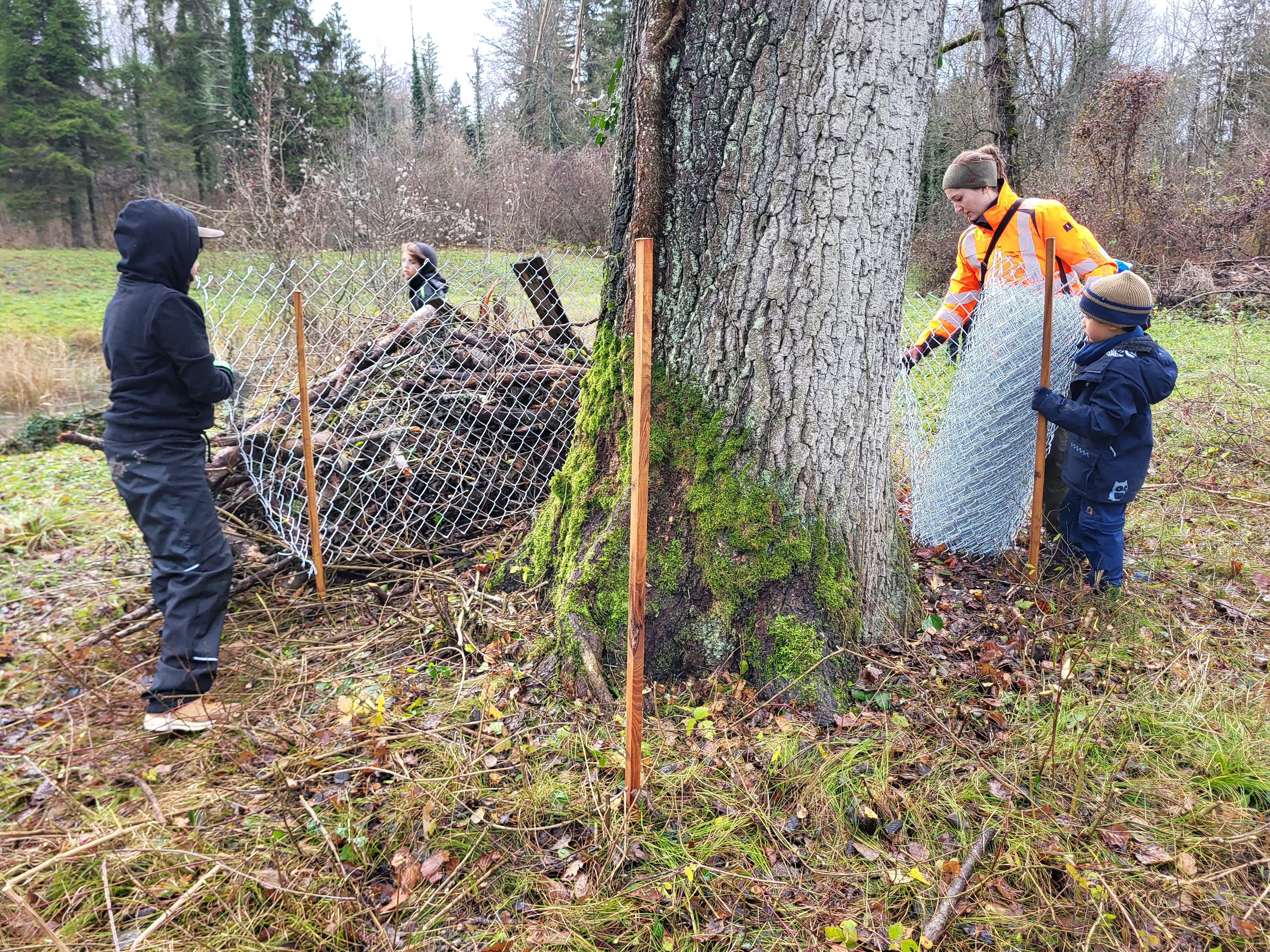Gemeinsam bauten wir stabile Schutzzäune um die alten Bäume. Diese Massnahme sorgt dafür, dass die wertvollen Samenträger und Habitatbäume erhalten bleiben, während der Biber in anderen Bereichen weiterhin seinen Lebensraum gestalten kann. Es war ein produktiver und anstrengender Nachmittag, an dem wir lernten, wie wichtig das Gleichgewicht zwischen verschiedenen Arten und dem Schutz des Waldes ist.