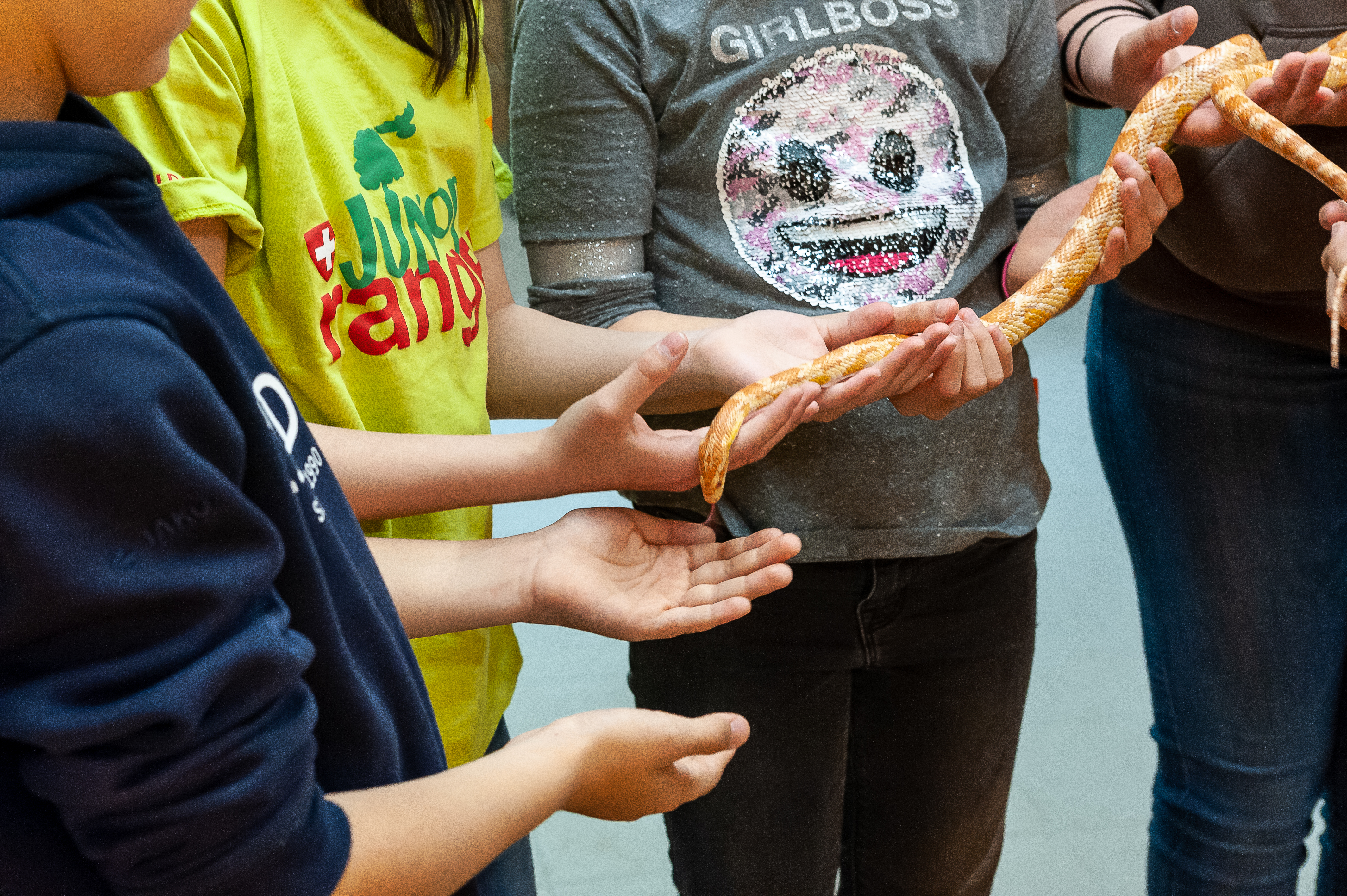 Kornnatter-7544 Published 22. Mai 2019 at 4256 × 2832 Die Junior-Ranger des Natur- und Tierparks Goldau lassen unter Anleitung eine Kornnatter über ihre Hände gleiten.